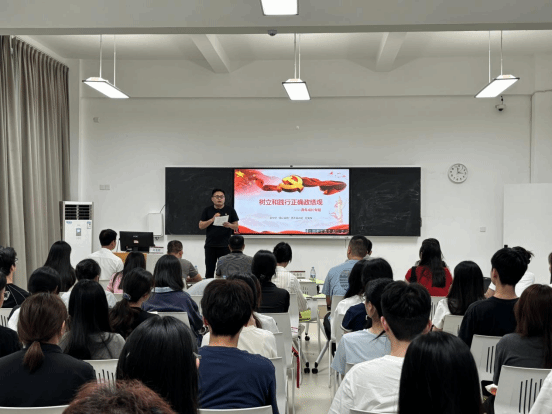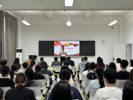柯美辉围绕树立和践行正确政绩观。从学习教育的重要意义、青年开展学习的必要性、正确政绩观的核心内涵、争做青春实干的身边典范、守住“三条线”五个层面展开讲授。他结合典型案例,辅以图片、视频等生动素材,深入浅出地阐释了政绩观对青年成长的关键指引作用。柯美辉勉励师生党员,要深刻认识正确政绩观的实践要求,在思想淬炼中把准方向,在实干担当中积累经验,在榜样引领中激发斗志,在纪律约束中筑牢底线,将正确政绩观融入日常学习生活,以踏实奋斗服务师生,为祖国的发展贡献青春力量。