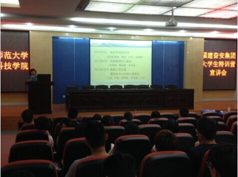 6月11日下午,福建奋安集团一行四人来学院进行暑期大学生特训营宣讲和招聘,在学院院长邱永渠教授、经管系副主任刘武强、陈晓川和校企合作负责人刘标等老师的大力支持下,于下午14:30在学校图书馆学术报告厅举办了现场宣讲和招聘会,此次前来参加招聘会的学生超过130人。福建奋安集团人资总监陈凌芹女士详细向大家介绍了企业发展状况,现场互动频频,气氛融洽。