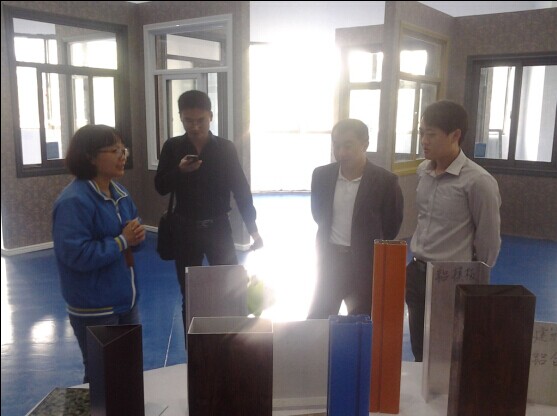 (陈副总在体验中心为陈主任等老师一行介绍奋特色铝单板、铝模板)