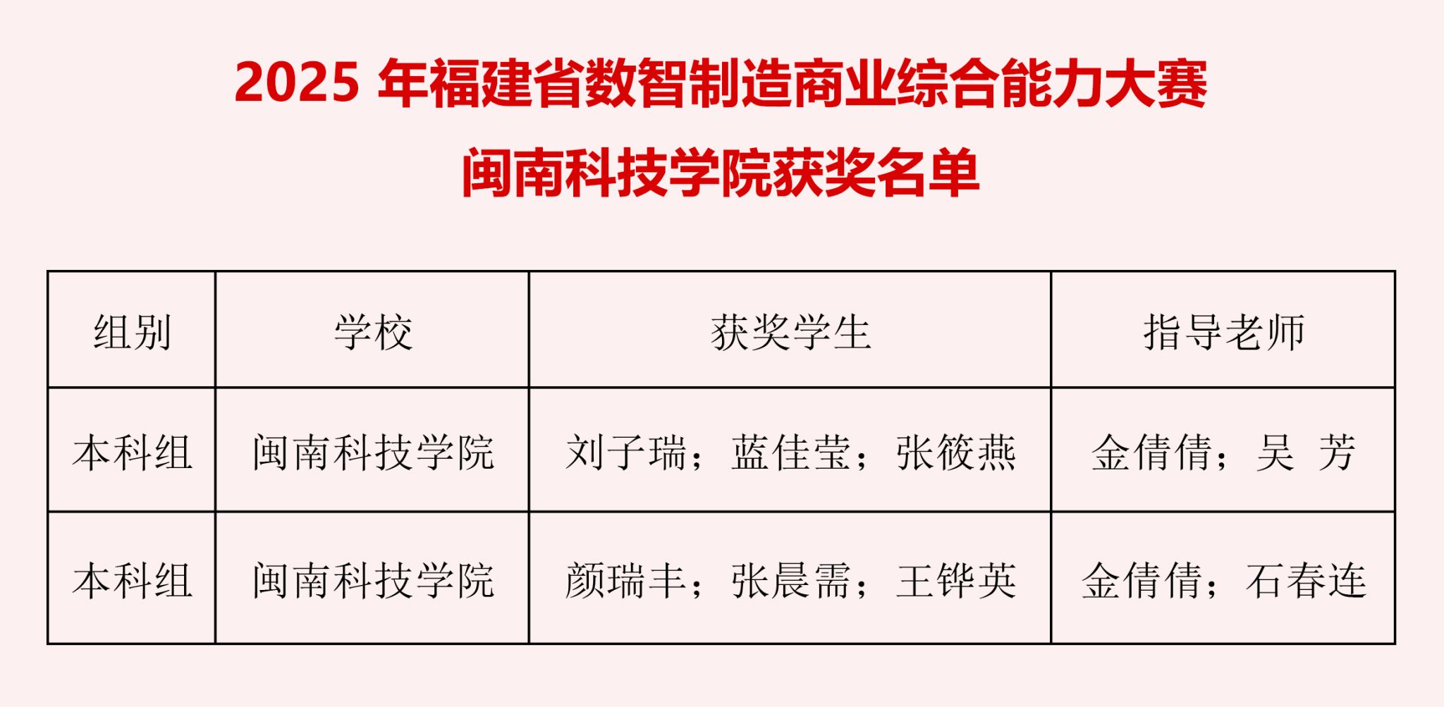 10月25日,由福建省教育厅主办的福建省第三届数智制造商业综合能力大赛圆满落幕。我院选派的两支队伍在激烈竞争中脱颖而出,分别获得本科组团体赛三等奖,彰显了学校在数智人才培养方面的育人成效。