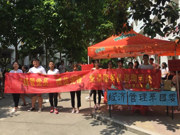 9月9日,为了发挥党员先锋模范带头作用,弘扬优秀党团品质,用实际行动深入践行“两学一做”,经济管理系党总支积极响应专设迎新党员服务岗,组建了一支由学生党员和入党积极分子组成的志愿服务队,开展“经管党员,模范先锋”党员服务队咨询活动,为刚入学的经济管理系新生提供校园咨询、解说学校概况以及入党知识普及。